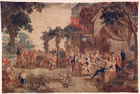 Overigens, Antoinette, als je zelf eens naar die prenten van Kroegleven gaat kijken, of het tapijt in het Noordbrabants Museum, zal het je opvallen dat daar inderdaad niet bijzonder veel op gedronken wordt. Er is zelfs een prent van Brueghel, met een groot gezelschap, waar maar éen of twee mensen een beker of kan in de hand hebben. Daar gaat het duidelijk om het feestvieren, minder om de drank. En dat is strekking van mijn verhaal, niet of er in Oeteldonk nou wel of niet teveel bier wordt gedronken.