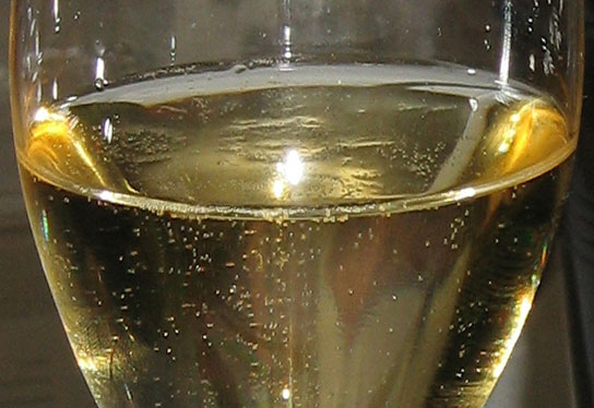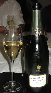 – Dan was nu de topper van de bijeenkomst aan de beurt: Bollinger La Grande Année 1999, Prestige Cuvée (jawel, de wijn van James Bond). Dit is echt een klein feestje in de fles, zoals Daan het noemde. De wijn had een prachtige goudgele kleur, geuren van appelcider en boerenjongens en tonen van hout. De Bollinger werd bovendien geschonken in andere glazen dan de vorige champagnes: bredere en bollere kelken, die meer ruimte aan de wijn en de aroma’s gaven dan een gewone flûte. Het was een enorm complexe wijn, waar je niets bij hoefde te eten om er van te kunnen genieten. Daan suggereerde een geroosterd kaneel-rozijnenbroodje met blauwaderkaas, wat me inderdaad een heerlijke combinatie leek. De basiswijn rijpten in kleine eikenhouten vaten en lag tot voorjaar 2007 ‘sur lattes’. Samenstelling: 63% pinot noir en 37% chardonnay.