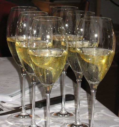 Het afgelopen jaar heb ik me verdiept in cava en daarin de vele verschillen leren kennen. Aangezien de ene mousserende wijn de andere niet is, vond ik het echter ook tijd om aandacht aan champagne te besteden. Toen een kennis deze zomer aankondigde dat hij weer champagneproeverijen ging organiseren, hebben Nico en ik ons dan ook onmiddellijk opgegeven. Half november was het zover: samen met drie andere geïnteresseerden schoven we aan de keukentafel van Daan Quakernaat, een echte champagneliefhebber, om tijdens een bijzondere sessie negen champagnes te gaan proeven. Iedere aanwezige had bovendien een gerecht gemaakt, zodat we telkens na twee champagnes een pauze met onder andere zelfgemaakte kalfstartaar, eendenleverpaté, gebraden eend en zelfgemaakt bramenijs konden inlassen. Een filmpje over het openen van een fles champagne tijdens deze bijeenkomst stond al eerder op Wijnkronieken.