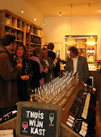 Exact om drie uur knipte chefkok Gerrit Greveling van Chalet Royal (Den Bosch, één Michelinster) vanmiddag het rode lint door dat voor de ingang van het pand De Gelaersde Haen aan de Hinthamerstraat 102 was gespannen. Het verzamelde gezelschap van familie, vrienden, Bossche restaurateurs en andere genodigden werd vervolgens onthaald op een fruitige champagne van Gosset, kon de stijlvolle winkel met gebeitste houten kasten bewonderen en een aantal fraaie wijnen proeven. Open stonden onder andere een frisse Riesling Trocken 2007 van Ernie Loosen, een vrolijke, fruitige rode Costières de Nîmes en een tamelijk minerale Chardonnay uit de Languedoc.