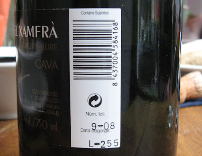 Dit zou vaker op het achteretiket van een mousserende wijn moeten staan: de datum van het degorgement. Op deze foto van een fles cava van El Xamfra staat duidelijk te lezen ‘date degorge 9-08’. Het is een – in Spanje en Frankrijk – niet-verplichtte aanduiding, die echter wat mij betreft best verplicht zou mogen worden. (De codering voor de partij staat wat verkeerd, dat wel…). Met de date degorgé kun je een houdbaarheidsdatum voor een fles mousserende wijn afleiden, erg handig! Deze fles El Xamfra is in september 2008 op de markt gebracht; ik zou hem opgedronken willen hebben voor eind 2009.