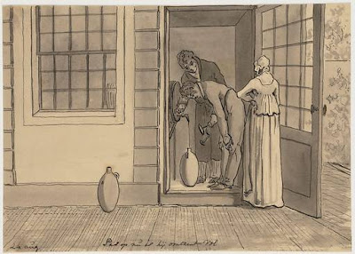 In ieder geval geen madera, die lijkt in flessen aangeleverd te worden. Het bijschrift bij onderstaande tekening van 27 augustus 1805 spreekt van de heer Thierens ‘die de madera vergeten is’. De vrouw op de tekening wijst naar die flessen, neem ik aan.