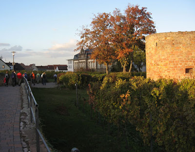 Na het dumpen van de koffer restte mij nog net een half uurtje om de wandelschoenen aan te trekken: we gingen om 14 uur onmiddellijk op pad, de wijngaarden en het Haardtgebergte in. De 16 man en vrouw zetten er een stevig tempo in. Eerst door het vriendelijke Forst, waar de Weinstrasse dwars door het dorp loopt en de wijngoederen zich aaneenrijgen. Dan door beroemde wijngaarden als Jesuitengarden, Kirchenstuck, Ungeheuer en Freudenstuck. Na een stevig klim, onder andere langs een oude basaltgroeve en dwars door het bos, arriveerden we in de ruïneWachenberg. De koele Riesling smaakte er uitstekend..
