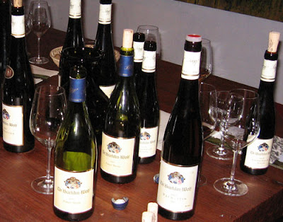 Na een steile afdaling liepen we door het dorpje Wachenheim in de avondschemering naar het Weingut Dr. Bürklin-Wolf, waar we vervolgens zeer professioneel werden onthaald. In de stijlvolle ontvangstruimte was de proeftafel al voor ons gedekt. Heerlijk, een proeverij waarbij je zittend mag genieten. Dat is wat mij betreft essentieel om aandachtig je ‘werk’ te kunnen doen. Het glaasje Ortswein (Wachenheimer Riesling 2008) ging er wel in: een prettige, mineralige wijn met veel frisse zuren. Helaas bleken mijn proefvaardigheden die dag gehinderd door het hoestmedicijn dat ik de afgelopen dagen tegen de kriebelhoest had genomen. Een echt goed oordeel vormen over de wijnen van Bürklin-Wolf (BW) kon ik dan ook niet.